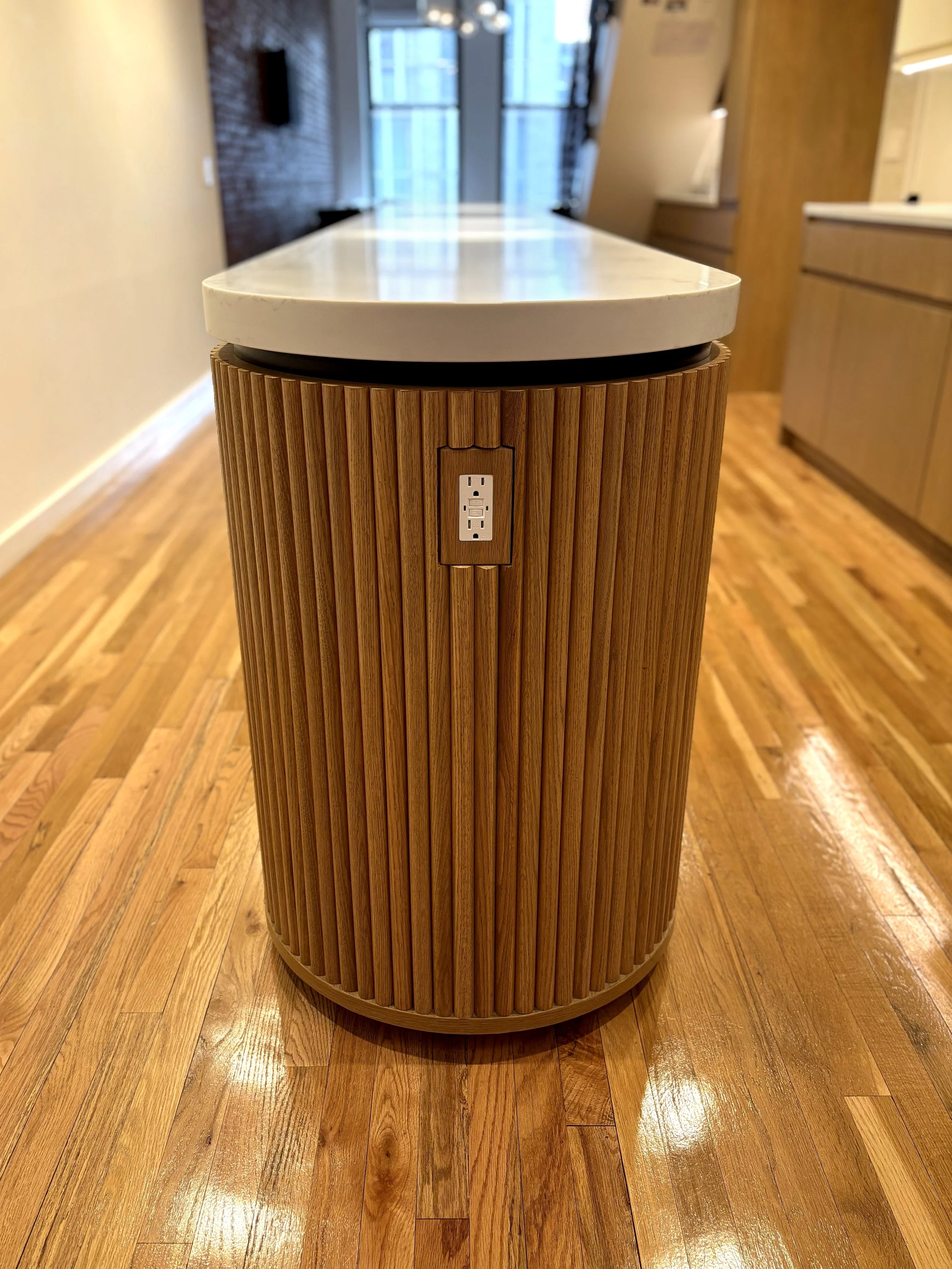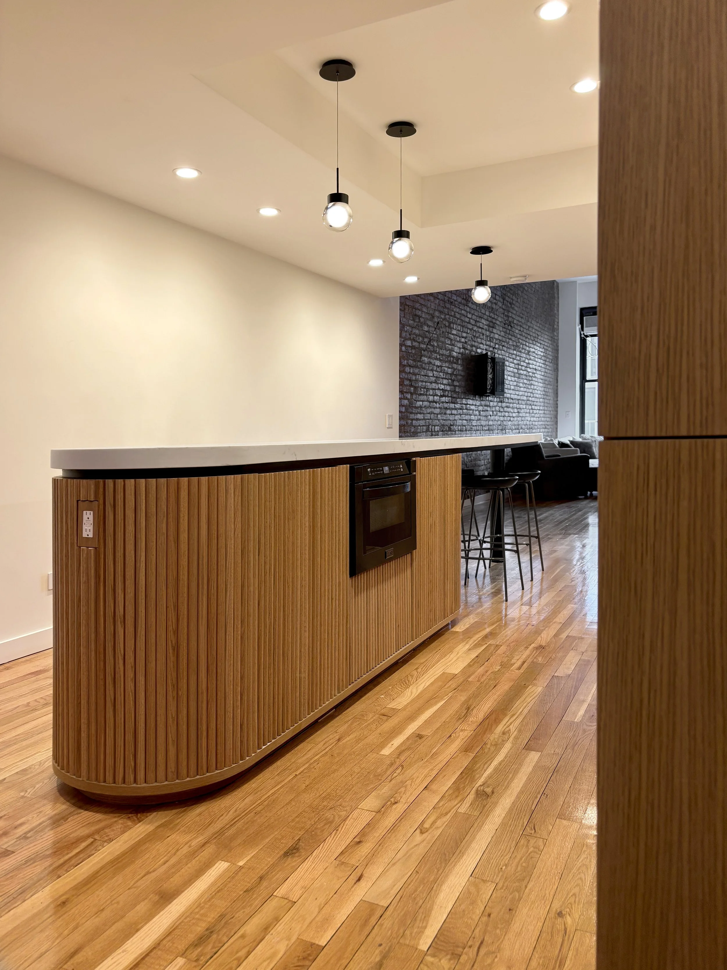 The key here was a tactful use of the “kitchenette” within NYC building code as a way to keep a kitchen area beyond 30 feet from the windows. With a combination of layout and a 12” soffit to serve as a smoke curtain, this layout gave the clients (who loved to cook at home) an amazing linear kitchen with a long island for seating and prep.