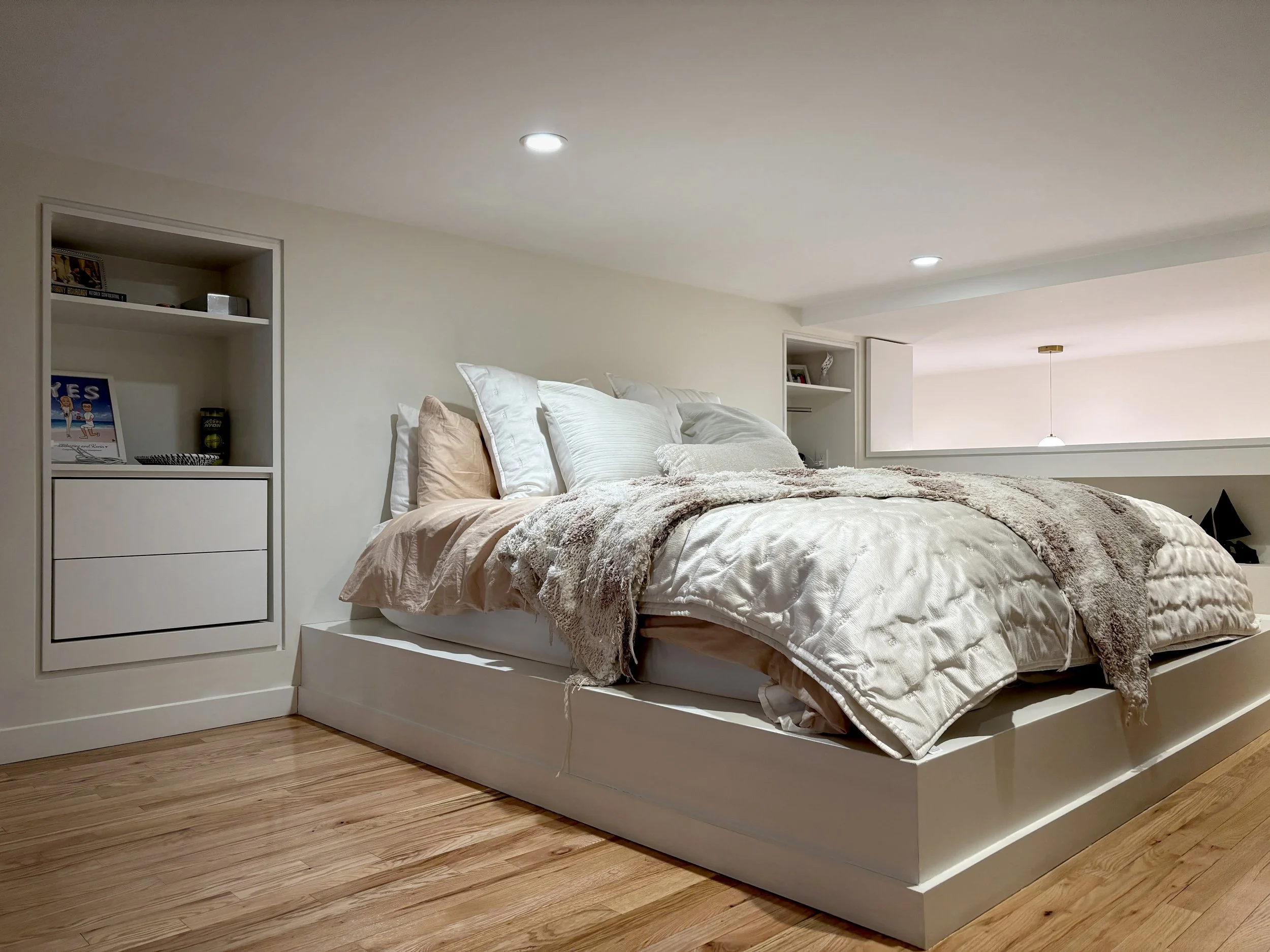 Without a doubt, millwork became the mechanism for transforming the space while also tying it together. The entry celebrates the full of the apartment while also letting the sleeping loft open up to double-height space on both sides. From there, custom millwork in white oak helped define closets, built in storage, kitchen millwork, more storage and a beverage bar tucked until the stairs.