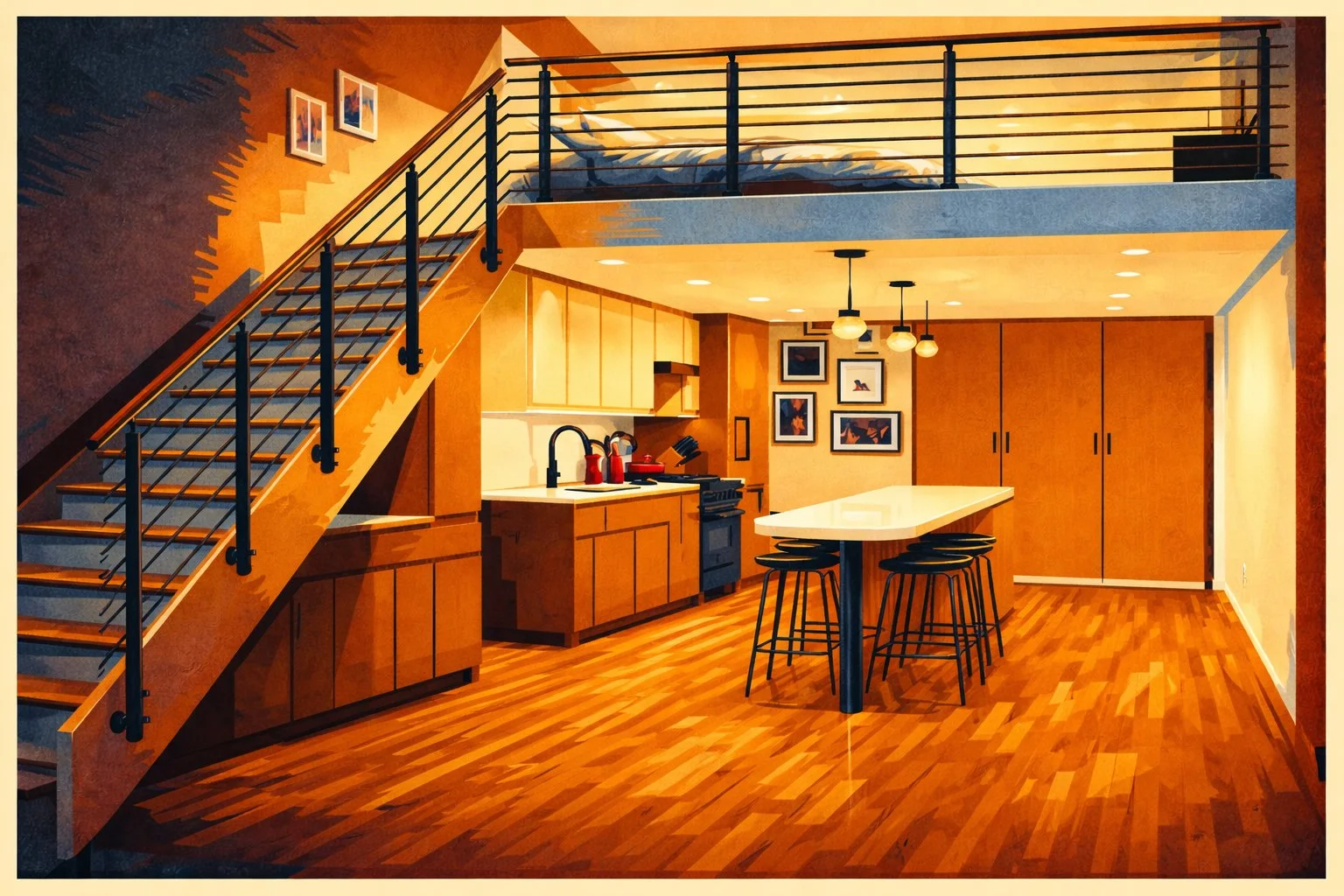 The trick here is that with only having windows on one, short end of a very long apartment there were restrictions on how the space could be divvied up into residential use. The high ceilings gave way to the opportunity for lofts and mezzanines, but “dark” space near the front door could be difficult to program.