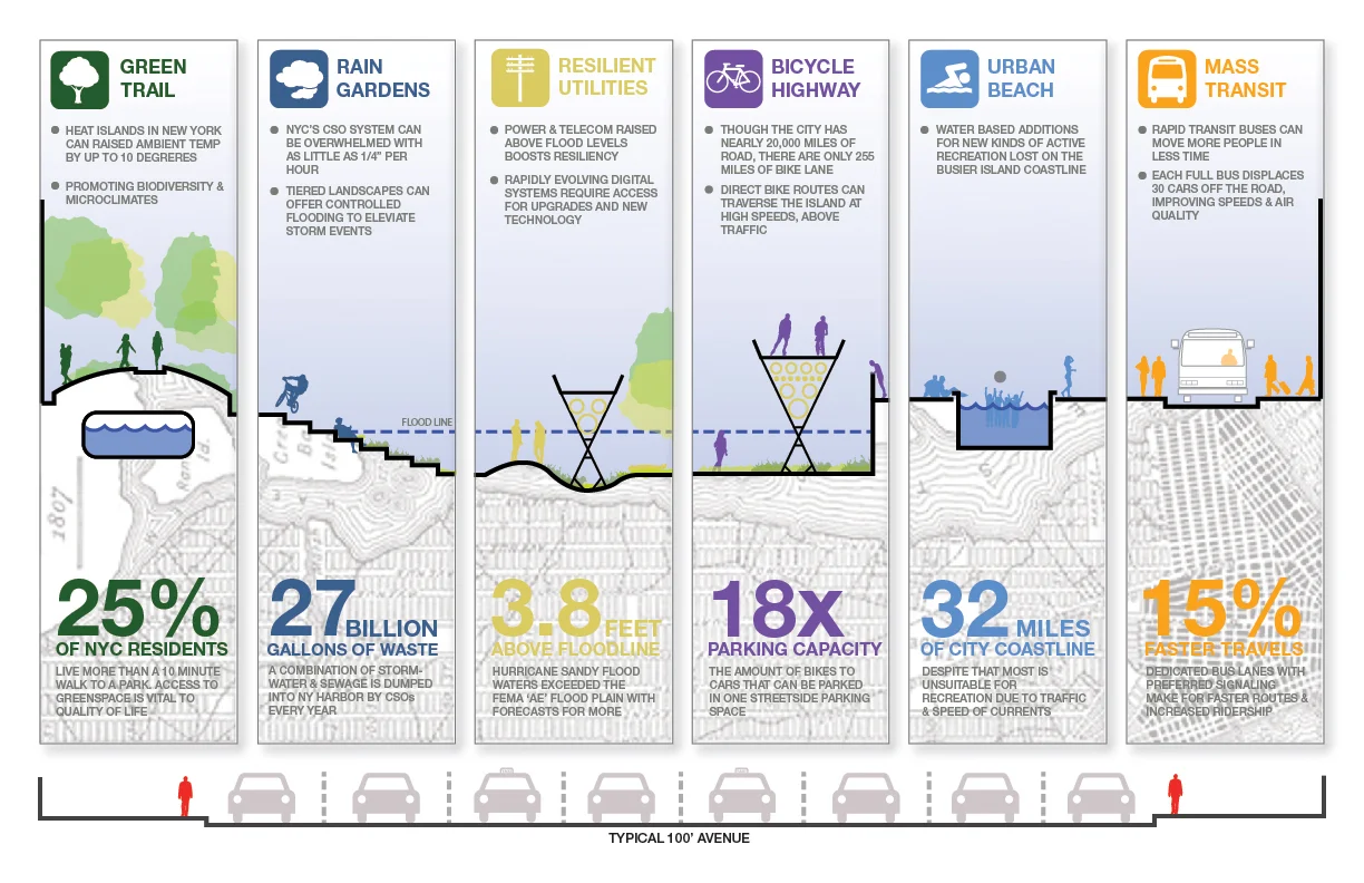 If pedestrians and their ability to move around the city carries so much value, then why do cars get such a disproportionate amount of the ground plane for transportation? This proposal offers some preliminary thoughts on what options would be available for the square footage currently assumed by car travel, highlighting a series of possible uses, each with different relationships between people, buildings and existing infrastructure.